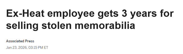 北京时间1月24日,迈阿密热火队一名前安保人员,因在任职期间盗窃数百件球员落场版球衣及其他珍贵体育纪念品,被判处3年联邦监禁,同时被勒令赔偿近190万美元。
